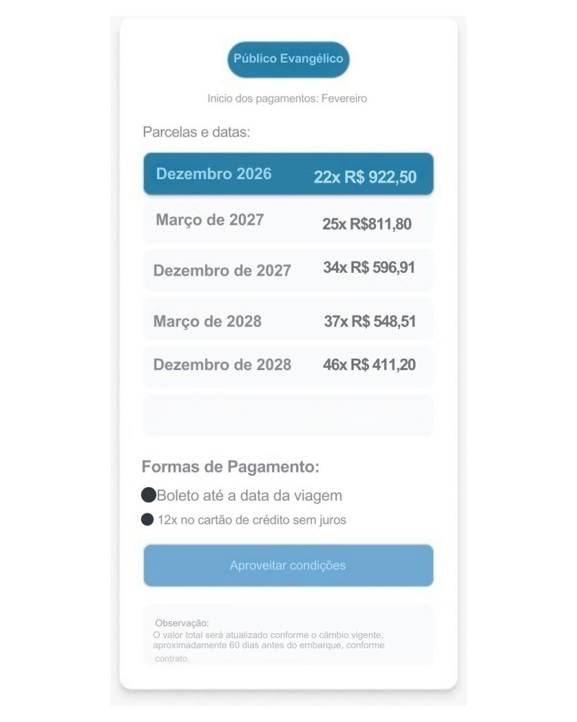 Enxergamos esta jornada como um investimento na alma, o sonho de uma vida. Por isso, nosso pacote é 100% completo, incluindo aéreo, hotéis de alto padrão, todos os passeios, guias, alimentação e seguros, sem surpresas ou taxas escondidas. Para tornar este sonho mais acessível, oferecemos condições de parcelamento flexíveis e facilitadas, que se encaixam no seu planejamento financeiro. Converse com um de nossos especialistas para conhecer o plano de pagamento ideal para você.
