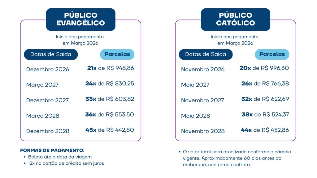 Uma viagem completa e guiada à Terra Santa, incluindo passagens, hospedagem, traslados, guias e momentos de fé.